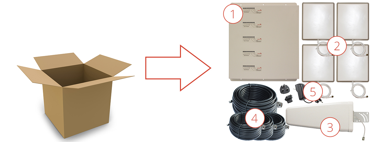 The i-repeater is a 5-band mobile signal repeater that can be monitored and controlled over the Internet. You can install the i-repeater with 4 line amplifiers to bring the mobile signal even further into the building, as you see in the picture below.